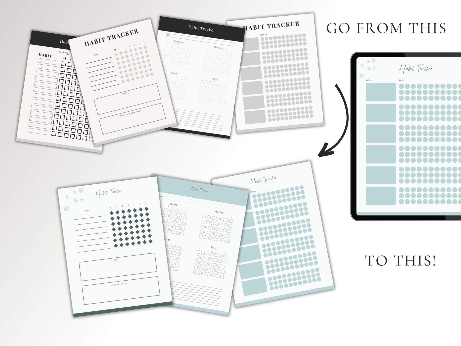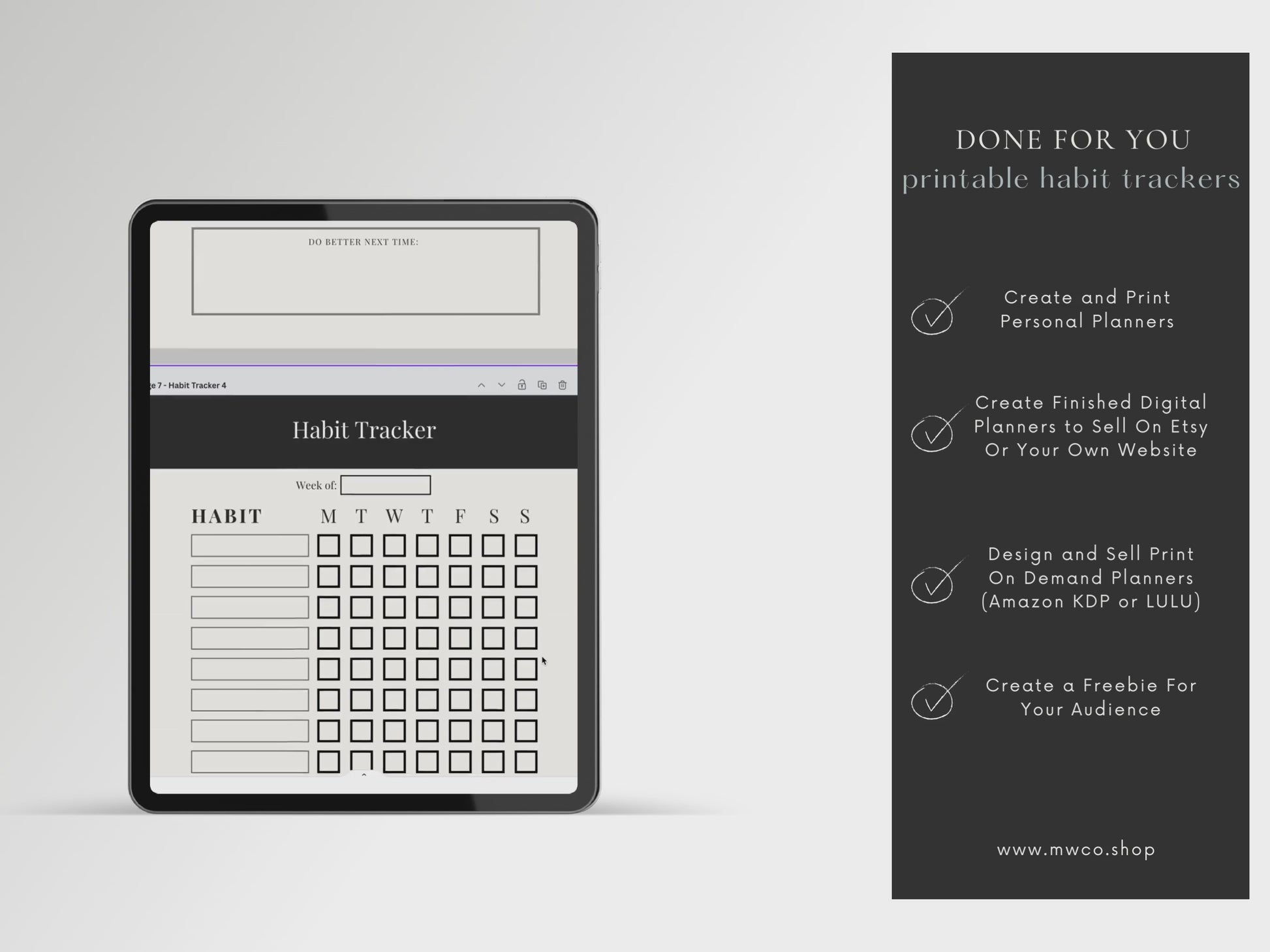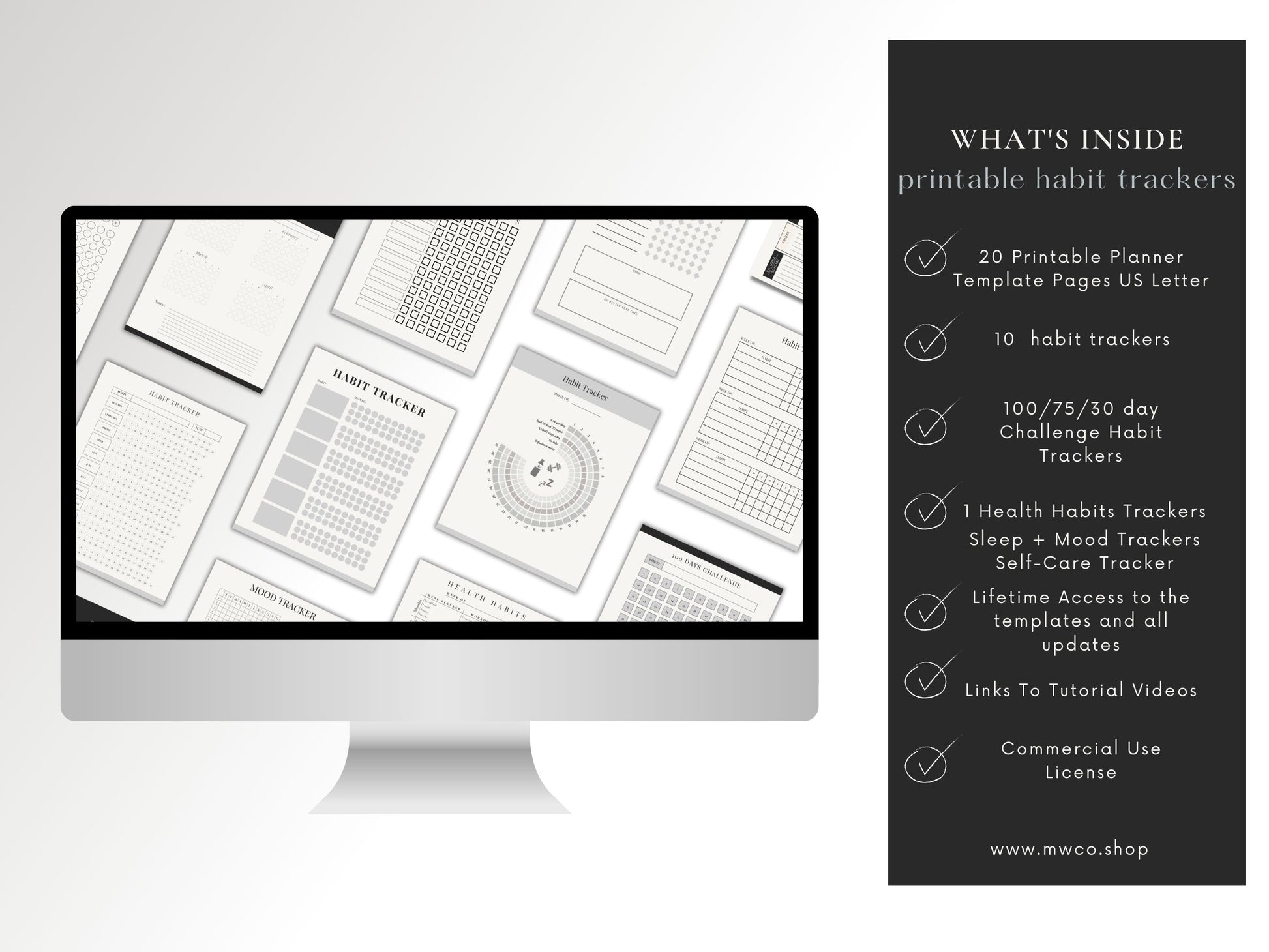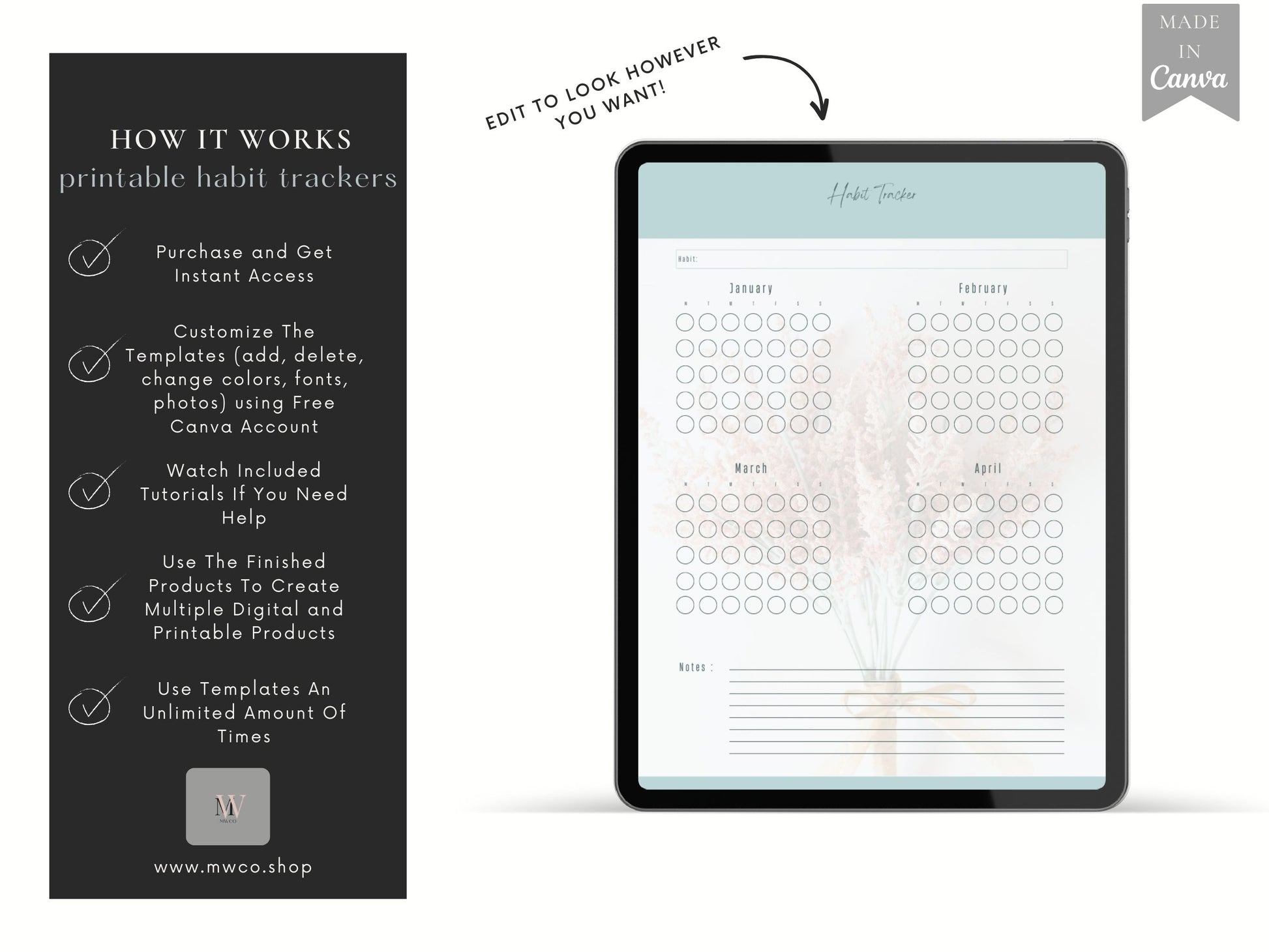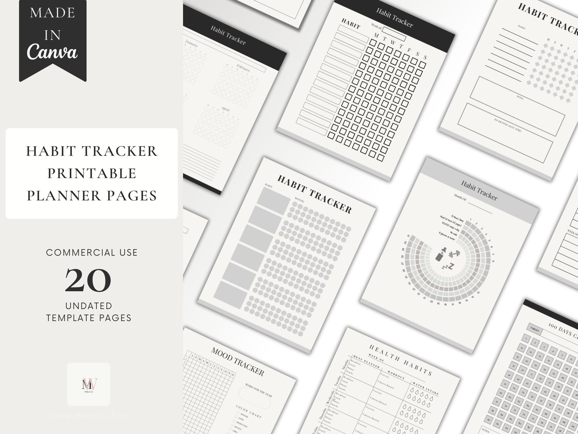 These Printable Habit Tracker Digital Planner Page Templates can be edited with a FREE Canva account. You can use them for personal use or with the commercial license (PLR) you can edit it and create hundreds of new products to sell from these templates.